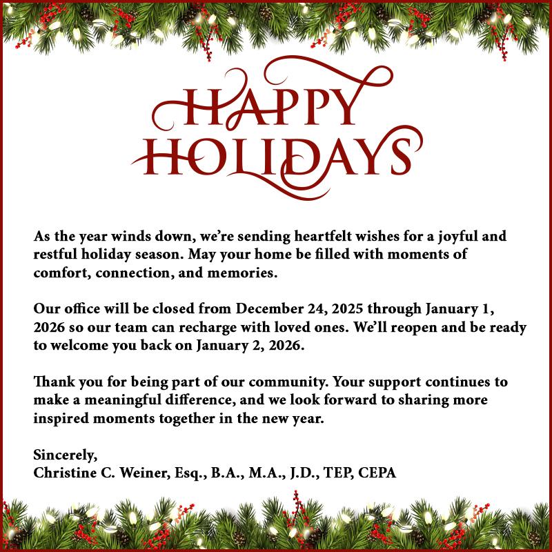 What are your greatest concerns, your hopes for the future, your dreams? At the law firm of Christine C. Weiner, we help you zero in on what matters most to you in life, show you that you can dare to dream big, and then help you realize the dreams you hold most dear. How? By taking the time to get to know you personally, and by working closely with your advisors to combine your family’s legal, financial, tax, charitable and business matters into a cohesive overall plan.